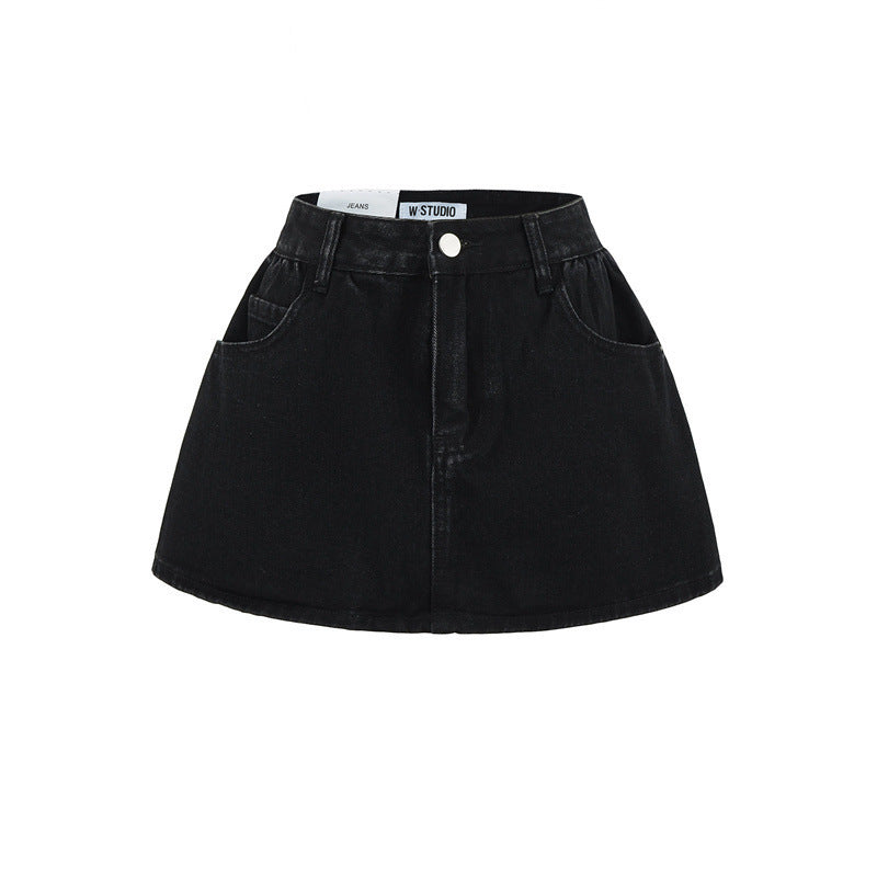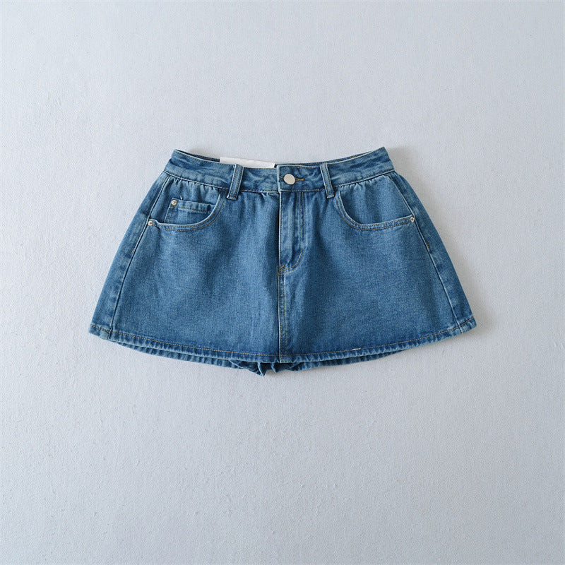 Retro Mid-low Waist Anti-exposure Denim A- Line Bubble Short Skirt